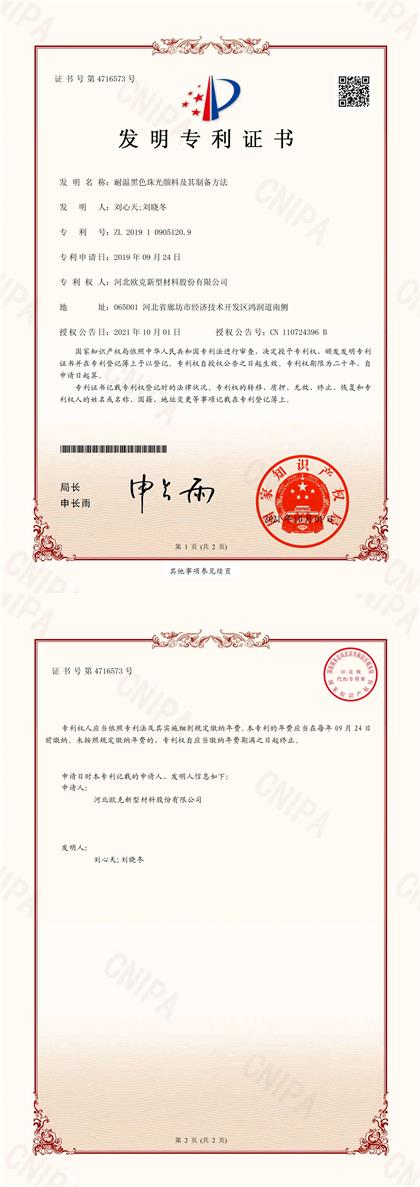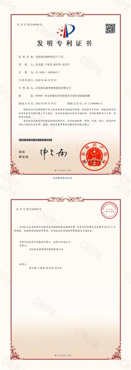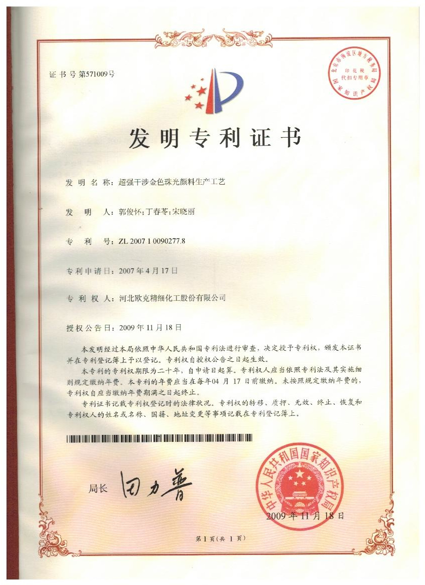 珠光顏料制備方法發(fā)明專利證書(shū)